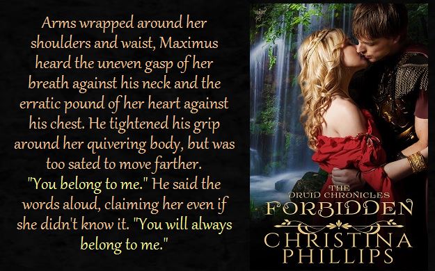 Other characters include Carys and Maximus, the hero and heroine of book 1, Forbidden, who play a key role in the novel. There is also Antonia’s father, who has his own secrets and the Praetor who does not have the best interests of Antonia and Gawain at heart. The tale is set against the backdrop of the Roman objective to annihilate the Druids and the power and influence they wield over the populace, by whatever means possible. Author Christina Phillips is in the Premier League when it comes to historical erotic Romance. Her novels have the perfect balance between erotic lovemaking and an exciting, credible and well crafted plot.