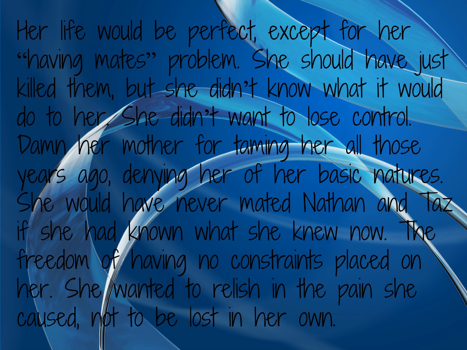 She needed to find someone to talk to, another Mystic perhaps, but she didn’t know who she could trust. She had done something no other Mystic had done before. She wasn’t like the rest of them. She was different. Some may even say defective. She didn’t want to become an inbred freak like the rest of them, but she feared it had been done. The things her uncle had succeeded in doing before she could get away from him, before she had the strength to kill him, may be coming back to haunt her.
